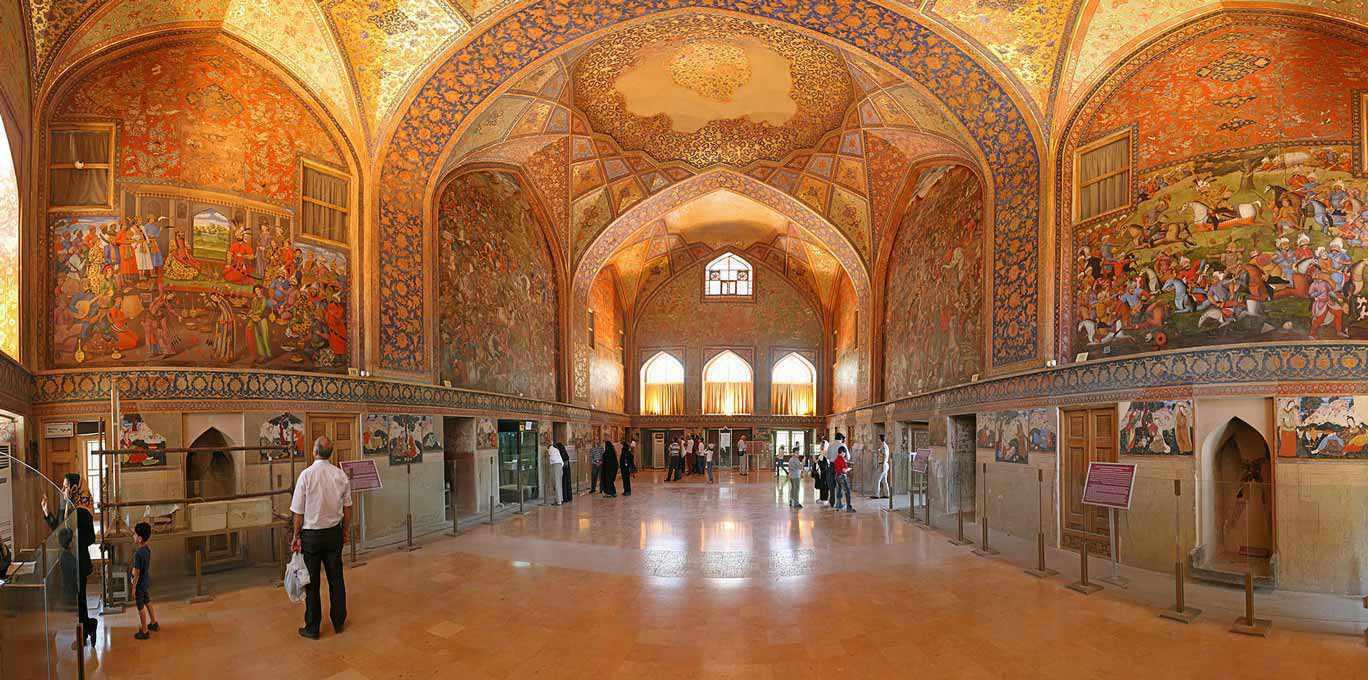 در این فضا در دیوارهای شرقی و غربی ان جمعا شش پرده پانل نقاشی موجود است که چهارنقاشی ان در چهارگوشه قرار گرفته اند، از یک سبک نقاشی مرکب و دو نقاشی میانی از دو سبک دیگر تبعیت میکنند. البته تاریخ نقاشی ان چهار پانل کنار هم حدود 5/1 قرن مقدم بر ان دو پانل میانی است. نقاشی اول: اولین نقاشی که به ان میپردازیم در گوشه شمالی ضلع غربی قرار دارد که ابعاد ان با7/5 مترطول و 2/2متر عرض است که نشان گر صحنهای تاریخی از فضای داخلی دربار عصرصفوی استکه توسط استاد رضا عباسی به تصویر کشیده شده است. نقاشی اول: در تصویر اول نقاشی شاه عباس اول را میبینیم که با سبیل بلند در سمت راست میانه نشسته و روبهروی ان ولی محمدخان دیده میشود. در ان زمان ولی محمدخان برای پس گرفتن حکومت خود نزد شاه عباس اول امده بود. اگر در تصویر نگاه کنید، مشاهده میشود که ولی محمدخان دست راستش را در استین فرو برده. از نظر مفهومی در قدیم دست راست در استین بردن نشانه تعظیم و احترام و درخواست کمک بوده که ضربالمثل "دست در استین بیرون اورده" به معنای گستاخی میکنی، از همان دوره رواج پیدا کرده است. در سمت چپ شاه عباس، سرداران وی در مجلس حاضر شدند. از جمله نفر اول که با شکم بزرگ در کنار شاه عباس قرار گرفته. او همان الله وردی خان، سردار وفادار شاه عباس است. نقاشی دوم: در مقابل تصویراول، نقاشی دیگر با همین ابعاد و سبک نقاشی شده که مجلس شاه عباس دوم را نشان میدهد که در مقابل ان، ندر محمدخان پادشاه دیگر ترکستان مشاهده میشود. گفته میشود که ندرمحمدخان جهت بازپسگیری حکومتش نزدشاه عباس دوم امده بود. اگر دقت کنید در تصویر میبینید که ندرمحمدخان دستش را به نشانه کمک خواستن از شاه عباس دراز کرده است. در بالا پرده در گوشه سمت چپ ظروف طلایی مهمور نشان داده میشود که برای سرو غذا استفاده میشد. در ان زمان غذا توسط پیش مرگان ازمایش شده و پس از اطمینان از سالم بودن ان، غذا را به حضور شاه میبردند. نقاشی سوم و چهارم: در ضلع غربی و شرقی دو پرده نقاشی با سبکی متفاوت موسوم به قهوهخانهای مشاهده میگردد که به ترتیب دوجنگ تاریخی را که یکی برد و دیگری باخت است را به تصویر کشیده. اولی جنگ چالدران است که در سال 920هجری قمری در غرب ایران در دشتی به همین نام بین شاه اسماعیل اول و سلطان سلیم پادشاه عثمانی رخ داده. در این جنگ سپاهیان عثمانی به دلیل کثرت سپاهیان و سلاح بر ایرانیان پیروز شدند. در مقابل ان تصویری از جنگ کرنال بین نادر شاه افشار با محمدگورکانی پادشاه هندوستان در سال 1115را نشان میدهد. در این جنگ ایران توانست دهلی را تسخیر کند و ذخایر بیشماری از جمله:الماس کوه نور در بریتانیا، الماس دریای نور در موزه جواهرات ایران و تخت طاووس را به دست اورد. متاسفانه تخت طاووس تکه تکه شده و چیزی از ان باقی نمانده. نقاشی پنجم: این نقاشی در جنوب دیوارغربی است و به سال 951هجری قمری باز میگردد که در این نقاشی مجلس پذیرایی شاه طهماسب صفوی از همایون پادشاه هندوستان مشاهده میشود. گفته شده همایون کشور خود را به دلیل شورش داخلی از دست داده بود و برای کمک نزد شاه طهماسب امده بود. در تصویر مشاهده میشود همایون، دودست خود را به نشانه نیاز به سوی شاه طهماسب دراز نموده. میوههایی که در کف زمین مشاهده میشود، نماد فراوانی در ایران است. نقاشی ششم: در این نقاشی صحنهای از جنگ در منطقه مرو بین شاه اسماعیل اول (اولین پادشاه صفوی) و شیبک خان ازبک اتفاق افتاده است. اگر خوب به تصویر نگاه کنید، درختی را بالای این تصویر میبینید که نشاندهنده درختی در همین منطقه است. در این جنگ ایرانیان پیروز شدند. طبق روایات گفته شده است که در این جنگ شاه اسماعیل، سر شیبک خان را میبرد و دستور میدهد که ان را طلااندود کنند و از سر ان به عنوان جام شراب استفاده میکنند که قدرت خود را نشان دهد. معماری کاخ چهلستون: طرح این کاخ پلانی به شکلUاست. معماری این کاخ ترکیبی از هنر معماری چینی، ایرانی و فرنگی است. در سقف تالار ترکیب کمنظیر از نقوش هندسی و گیاهی موجود است ک